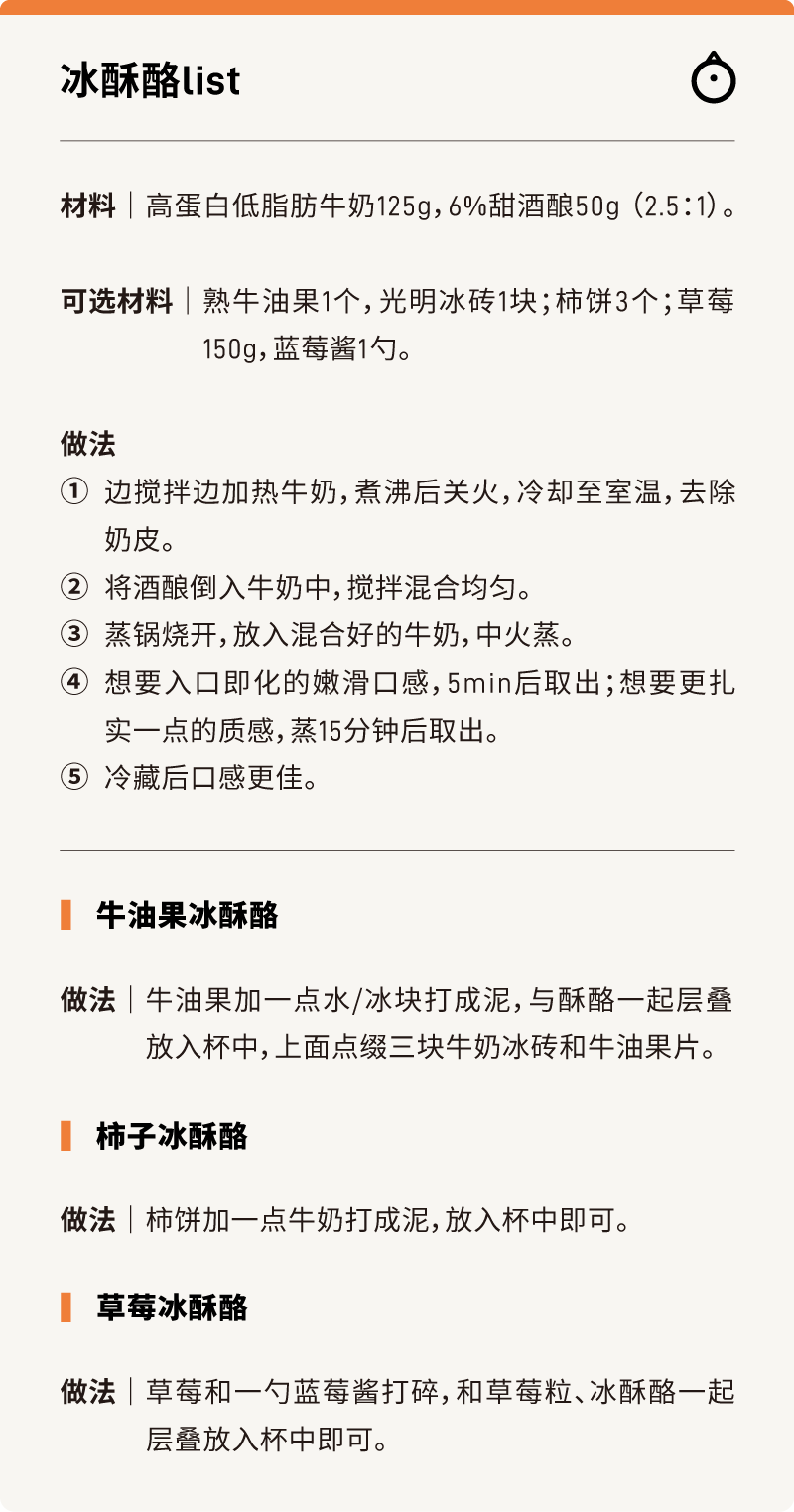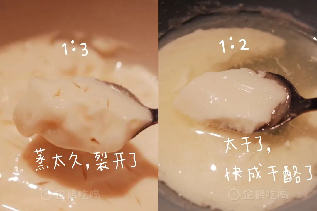 # 可能是最神秘的中式甜品之一…… **企鹅吃喝指南** 微信号 qiechihe 功能介绍 客观独立,亲身实测,专业严选,找遍来自全世界的好东西,和你分享吃得到、喝得出的快乐。 ____ ___发表于_ 收录于合集 大家好,我是喜欢研究老菜谱,立志传承中华美食的佩普西:)近期在xhs或下厨房找选题灵感,经常刷到一个神秘的中式甜品,而且几乎篇篇爆火,长得基本大差不差:白润润,有点像双皮奶。质地明显要细嫩柔滑多了,勺子一㧟就会柔软地散开,看起来好好吃喔!原料也很简单:米酒,牛奶,糖,买齐完全没有门槛,做法好像也就混一混热一热就出来了......(所以到底是什么爆火的神秘力量??)进一步检索了一下,发现这碗白润润嫩滑滑,怎么有这么多名字?? 在《红楼梦》里,它叫糖蒸酥酪,皇家独享的甜点,元春从宫里赏给小测成绩出色的宝玉,宝玉特意留给了袭人吃;电视剧《知否》又成功引流一波,它被唤作冰酥酪,是主角明兰姐妹们的最爱;《甄嬛传》里广受欢迎的酥酪,也是它。 再查查,原来这碗纤柔的甜品是纯正的北方血统!它有个更亲切且接地气的名字——老北京宫廷奶酪,或中式奶酪!南方的朋友也不陌生,这边的宝珠奶酪,XX酪酪饮品中的“酪酪”,也是它!(是不是如大梦初醒!)而且更神秘的是,在一众花名背后,“酥酪”的做法也开始扑朔迷离了起来......随手一搜,弹出满屏亲妈菜谱,基本不超过5步。但每个“亲妈”从原料配比到做法,完全不一样,一边要求微波炉打,那边说要冰箱静置,还都表示自己的方子能成功?请问你们真的在做同一种东西吗??  再往下翻翻,成功帖子下面, **更多的是翻车的血与泪** **;)** 包括我们,前后尝试过两次,结果都是彻底的完败本人佩普西,抱着和冰酥酪掰头到底的决心,本着格物致知的理念研究了全网几乎所有的宫廷奶酪/冰酥酪/自制宝珠......方子。在厨房捣鼓了整整两天,走过了所有错路,终于总结出一份保姆极 **0失败配方,材料极简,成败全在细节** 。完整方子照旧放在文末卡片了,下面是实验报告,两日的血泪记录,啊不是,是探索过程: **第一轮实验** ,首先我想搞清楚:酥酪配方中的 **米酒,到底是什么酒** ?网上众说纷呈,有用酒酿的,有说米酒,还有说要还在发酵中的“活着的”米酒,最好是自制米酒(再见了您)。到底是酒酿中的什么成分在与牛奶发生作用?我设置了如下对照组,拿清酒与3%酒酿,配上不同比例的牛奶,分别做了五碗:清酒的实验组保证了酒精的比例和酒酿组一致(是的,本理科生单独算了酒精比例)。全部蒸20分钟,再冷却后,清酒组全部无法凝结,只有 **1:3的酒酿组** 微微凝固。似乎成功已经初露苗头了!! **做冰酥酪用酒酿就可以** ,以及内心窃喜着没必要自己做米酒了;)虽然有效成份仍然未知,但我信心倍增,立马开启 **第二组实验** —— **研究酒酿与牛奶的配比!** 还得意地追加了两个大份:分别是酒酿与牛奶1:3和1:2的比例,放进蒸锅里蒸,等着看哪个好吃,就差不多工作完结撒花了结果开完会,一小时后回来—— 这是怎么回事??凝固是凝固了, **但这不是嫩滑滑的酥酪啊!** 已经要凝成干酪了好吗?乳清分离严重,固体部分偏干,吃起来有粉粉的乳酪质感......而且1:2的明显比1:3的更干更粉。同事安慰我:想开点,至少你成功做出了两碗干酪含泪处理掉了失败作,本轮实验学习到的新知识点:蒸制的时长越长、酒酿比例越高,乳酪会越干。所以 **不能蒸太久,酒酿与牛奶比例介于1:2~1:3之间为好** ,接近1:2,乳酪就可能偏干。头一天的两轮实验,以0.25份的成功宣告结束,摄影师都下班了,独留我一人与两大碗干酪在公司……隔天再战, **第三次实验** :换了酒精度更高的酒酿(6%),牛奶也升级成了香甜浓郁的水牛奶。 **直接全上高配,怎么可能不成功!!** 然后,我又被现实教育了;)不管前后用多大火、蒸多久,乳酪都无法凝结,甚至还蒸出了“烤奶”的颜色和风味……感觉距离酥酪越来越远了啊啊啊啊啊啊连续的挫败让我不敢再贸然大手笔实验了(也不想再洗锅洗碗了)。外场求助了搞化学研究的朋友,这才恍然大悟形成乳酪的原理,是 **牛奶中蛋白质遇到酒精或酸性物质变性凝结。** 一旦牛奶中脂肪含量高了,脂肪会包裹蛋白质阻止它发生反应,所以脂肪含量更高的水牛奶根本凝结不起来噢! 这也说明了网上配方中,都有一步需煮沸牛奶,等冷却去掉奶皮的真正作用——不是为了浓缩牛奶(仅仅煮开是无法浓缩牛奶的!),而是 **降低牛奶中的脂肪含量** ,提高蛋白质变性凝结的概率!! 所以选择牛奶时,要 **尽量选择蛋白质含量高,脂肪含量低的牛奶** 。此时也很想问自己,为什么不早点想到场外求助呢orz  没做成功的酒酿烤奶也没浪费,加了一点花生酱和咖啡饼干碎做了一杯花生烤牛乳酪,酒酿的一点酸度刚好平衡浓郁的花生,收获一杯好喝的热饮~既然已经知道了用什么米酒,用什么奶,合适的比例区间,蒸制时长,那 **第四次挑战** ,我,准备好了。果然,选对了 **牛奶(冰鲜巴氏牛奶)** ,用加强版酒酿来做成功率一下子变高了!上锅蒸5分钟立马凝结!是真真正正,又嫩又滑的酥酪!!我做出来了(此时打字的手也在颤抖)!已经摸透了成功的基本诀窍,还剩那么多原料呢,做都做了具有钻研精神我怎么可能止步于此小小的胜利前?想要做出一份甜度适中、酒酿香浓、口感正好的 **100%** **完美酥酪** !又试了几个不同的版本,最终挑选出的这个方子,编辑部最挑剔的同事吃完表示 **愿意