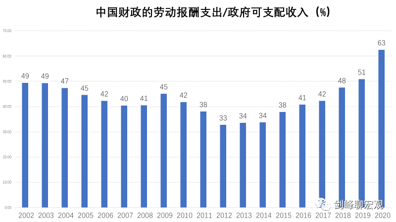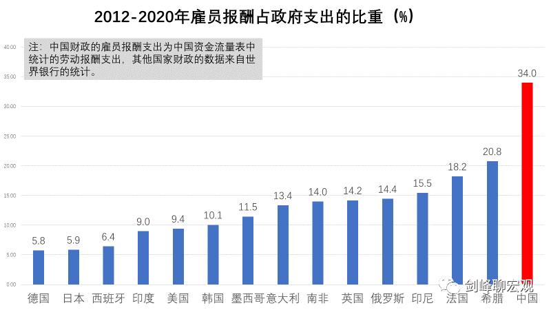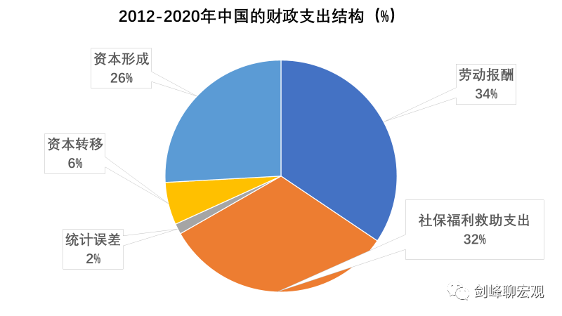 # 财政的“钱”去哪了? 原创 剑峰 [ 剑峰聊宏观 ](javascript:void\(0\);) **剑峰聊宏观** ![]() 微信号 jianfengliaohongguan 功能介绍 分析经济动向 分享读书体会 闲聊逸闻趣事 ____ ___发表于_ 收录于合集 在上一篇“为什么中国人不消费”中,我们看到,政府部门收入占比过高是我国居民部门收入占比过低乃至居民消费率过低的主要原因。实际上,那里的统计还低估了政府部门收入。如果考虑到在统计上被计入到企业部门收入、但实际上属于政府部门收入的国有土地出让金,那么,在2012至2020年间,政府部门收入占国民收入的比重将上升到25%。  既然政府部门收入占比远远超过其他国家,那么,财政的“钱”都去哪了?回答这个问题需要对中国财政支出的数据进行分析,而这是一件颇费周章的事情,因为中国财政支出的统计与其他国家都不太一样。 **1、打开财政支出的黑箱** 财政支出包括政府消费和政府投资两大项: 财政支出=政府消费+政府投资 其中,政府消费首先就是一个从未被打开过的黑箱。按照我国国民账户的统计规则,政府消费被界定为“政府部门为全社会提供的公共服务的消费支出和免费或以较低的价格向居民住户提供的货物和服务的净支出”。显然,从字面上去理解,并不能知道究竟何为政府消费,相关统计也从未公布过政府消费的具体内容。 根据世界银行关于财政支出的统计口径,政府消费主要是用于如下几项的财政支出:“雇员报酬”(compensation of employees)、“商品和服务支出”(goods and services expense)、 “补贴和其他转移”(subsidies and other transfers)。但是,在世界银行对各国财政收入与支出的统计中,唯独没有中国财政支出的数据(财政收入和政府负债的数据都有)。 参照世界银行的统计方法,本文根据国家统计局的资金流量表,并对照支出法GDP和财政部公布的数据对政府消费进行了推算。为了可阅读性,这里省却了具体的技术细节,直接给出统计的结果: 政府消费=劳动报酬支出+社保福利救助支出+统计误差 上式中,统计误差为支出法GDP中政府消费统计与本文统计的差额,在2018至2020年三年中统计统计误差平均不到5%。 在财政支出中,政府投资相对透明。政府投资包括两块:其一,政府的资本形成,即政府直接从事的投资;其二,政府的资本转移,即政府将资金转移给企业,通过企业间接进行的投资。 于是,整个政府的支出就是: 政府支出=政府消费+政府投资 =(劳动报酬+社保福利救助+统计误差)+(资本形成+资本转移) 将本文统计的政府支出与财政部公布的财政支出进行对比,可以发现两者几乎完全相等。例如,2020年财政部公布的财政支出为24.57万亿,本文统计的政府支出为24.41万亿。所以,统计方法上应该没有问题。  观察整个财政支出的结构,在2012至2020年间,基本上呈现出“三分天下”的格局:劳动报酬占比34%,社保福利救助占比32%,投资(资本形成与资本转移之和)占比32%。至于统计误差,只占2%。那么,这种三分天下的财政支出结构是否合理呢?以下我们将对比主要发达国家和新兴发展中经济体的财政支出结构,揭示中国财政存在的问题。 **2、财政支出的跨国比较** 中国当下的财政体制延续了1994年分税制改革后建立的基本框架。在笔者的《金融大变革》一书中,将这种财政体制称为“增长型财政体制”,以对应于成熟市场经济的公共财政体制。 除了央地分权结构存在差异外,两种财政体制的关键区别在于财政支出。在公共财政体制下,政府扮演的是“无形之手”的角色,主要职责是为社会提供公共品,因而财政支出以社会福利支出为主。在增长型财政体制下,政府扮演的是“援助之手”的角色,财政支出以政府投资为主,反映了发展中国家有为政府推动经济发展的主动作为。 随着经济发展和市场的成熟,财政体制最终应该转向公共财政。然而,对15个发达和新兴发展中国家的比较表明,这种转向在很大程度上并没有发生,甚至“援助之手”的职能也出现了异化。 从财政支出的跨国比较看,近些年中国财政体制呈现出三个特点: **第一,“抠门财政”。**  跨国比较的第一个发现是,中国财政的社会福利支出占比非常低。在2012至2020年间,中国福利支出占财政支出的比重只有32%,在15个国家中排名倒数第一。中国的福利支出占比低于发达国家体现了不同发展阶段财政体制的差异,这尚可以理解,但是,低于发展水平相近的金砖国家、尤其是发展水平比中国差很多的印度,就实在是不好意思了。之前的报告已经指出,中国居民消费率低的主要原因在于居民收入占国民收入的比重低,后者就同居民获得的社会福利收入较少有着直接关系。 **第二,“投资财政”。**  跨国比较的第二个发现是,中国财政支出中用于投资的比重非常高。以新冠疫情前八年的平均数据看,全部投资中,中国的政府投资占比高达36.5%,居于第二位的希腊也高达31%,日本和印度超过了20%,剩下11个国家都在20%以下。所以,中国政府投资的比重不仅高于发达国家,也高于发展阶段相近、甚至发展水平不如我们的国家。之前的报告已经指出,在中国GDP的需求结构中,投资率远远高于其他国家,这种发展模式难以为继。这里我们看到,高投资率的背后是政府投资过多。  从政府投资占比的时间序列数据看,从2002年到2012年,期间虽然2009年“四万亿”短暂地提高了政府投资占比,但总体趋势是私人部门投资增速远快于政府投资增速,