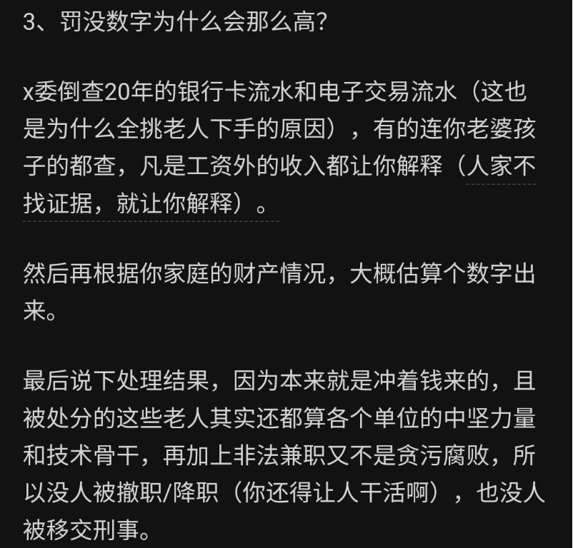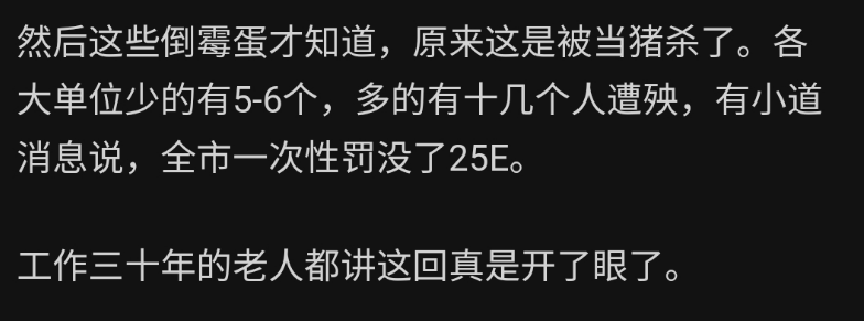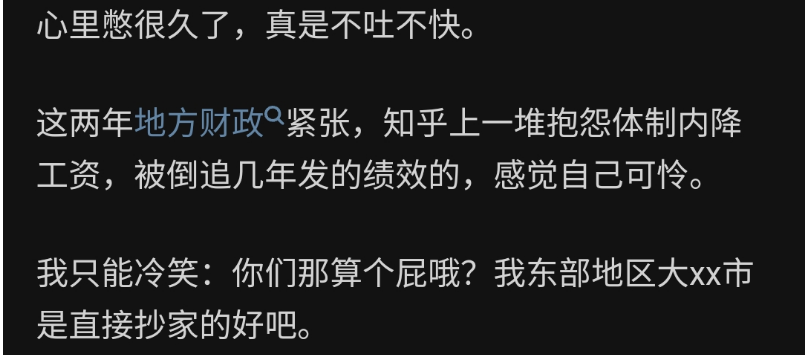 **小晖有感** ![]() 微信号 gh_4c93588fe042 功能介绍 我就是小晖,多谢你能找到我,我继续写,你继续看,可好? ____ ___发表于_ 收录于合集 我始终认为,只要有心去发现,总能发现不同的新鲜事,这样的新鲜事每天都在发生着,而且还在不同的行业里上演着,让网友们看得是目不暇接,异常的精彩纷呈。 就在前两天,江苏地区的公职网友又爆出这样一个内情了,说他们的同行被抄家了。  这回抄家的由头是这个市的公职人员非法兼职,罚得也厉害,少得罚六七十万,多的罚百万。  这一顿操作下来,罚没收入达到25亿。  知乎网友说出公职人员兼职的原因,还是因为那个城市的收入太低了。  这次被罚没的对象也是看人下菜的,基本上就是技术骨干,想安稳退休的那群人。  网友说这一波操作就是冲着钱来的。  很多公职人员为了凑齐罚款,把自己家里老人的棺材本都拿出来了。  为什么要这么搞,还是因为城投负债太高了。  没钱了,就只能搞出这样的操作。  这个网友是昨天早上六点左右分享这个内情的。  这个内情一曝,很多网友都要吃惊了,因为在大众的印象中,江苏应该是很有钱的,可是没想到下面的市也会缺钱到这个地步,以至于这次事业单位的公职人员会成为罚没对象。 江苏尚且如此,那经济状况不如江苏的省份呢?只怕操作会更精彩吧…… PS:今天推荐一个朋友的公众号,他也是写一个系列的,每天会分享各种新奇有趣的事,大家看看就好。他之前没了两个号了,这是他的第三个号……
