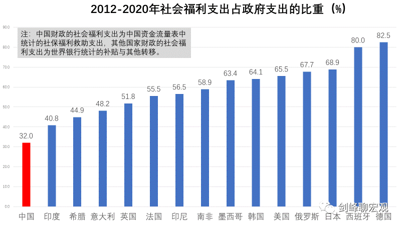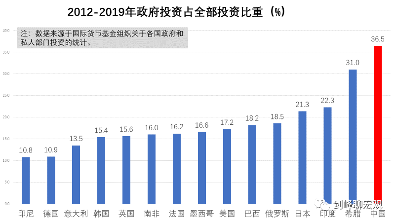 # 财政的“钱”去哪了? 原创 剑峰 [ 剑峰聊宏观 ](javascript:void\(0\);) **剑峰聊宏观** ![]() 微信号 jianfengliaohongguan 功能介绍 分析经济动向 分享读书体会 闲聊逸闻趣事 ____ ___发表于_ 收录于合集 在上一篇“为什么中国人不消费”中,我们看到,政府部门收入占比过高是我国居民部门收入占比过低乃至居民消费率过低的主要原因。实际上,那里的统计还低估了政府部门收入。如果考虑到在统计上被计入到企业部门收入、但实际上属于政府部门收入的国有土地出让金,那么,在2012至2020年间,政府部门收入占国民收入的比重将上升到25%。  既然政府部门收入占比远远超过其他国家,那么,财政的“钱”都去哪了?回答这个问题需要对中国财政支出的数据进行分析,而这是一件颇费周章的事情,因为中国财政支出的统计与其他国家都不太一样。 **1、打开财政支出的黑箱** 财政支出包括政府消费和政府投资两大项: 财政支出=政府消费+政府投资 其中,政府消费首先就是一个从未被打开过的黑箱。按照我国国民账户的统计规则,政府消费被界定为“政府部门为全社会提供的公共服务的消费支出和免费或以较低的价格向居民住户提供的货物和服务的净支出”。显然,从字面上去理解,并不能知道究竟何为政府消费,相关统计也从未公布过政府消费的具体内容。 根据世界银行关于财政支出的统计口径,政府消费主要是用于如下几项的财政支出:“雇员报酬”(compensation of employees)、“商品和服务支出”(goods and services expense)、 “补贴和其他转移”(subsidies and other transfers)。但是,在世界银行对各国财政收入与支出的统计中,唯独没有中国财政支出的数据(财政收入和政府负债的数据都有)。 参照世界银行的统计方法,本文根据国家统计局的资金流量表,并对照支出法GDP和财政部公布的数据对政府消费进行了推算。为了可阅读性,这里省却了具体的技术细节,直接给出统计的结果: 政府消费=劳动报酬支出+社保福利救助支出+统计误差 上式中,统计误差为支出法GDP中政府消费统计与本文统计的差额,在2018至2020年三年中统计统计误差平均不到5%。 在财政支出中,政府投资相对透明。政府投资包括两块:其一,政府的资本形成,即政府直接从事的投资;其二,政府的资本转移,即政府将资金转移给企业,通过企业间接进行的投资。 于是,整个政府的支出就是: 政府支出=政府消费+政府投资 =(劳动报酬+社保福利救助+统计误差)+(资本形成+资本转移) 将本文统计的政府支出与财政部公布的财政支出进行对比,可以发现两者几乎完全相等。例如,2020年财政部公布的财政支出为24.57万亿,本文统计的政府支出为24.41万亿。所以,统计方法上应该没有问题。  观察整个财政支出的结构,在2012至2020年间,基本上呈现出“三分天下”的格局:劳动报酬占比34%,社保福利救助占比32%,投资(资本形成与资本转移之和)占比32%。至于统计误差,只占2%。那么,这种三分天下的财政支出结构是否合理呢?以下我们将对比主要发达国家和新兴发展中经济体的财政支出结构,揭示中国财政存在的问题。 **2、财政支出的跨国比较** 中国当下的财政体制延续了1994年分税制改革后建立的基本框架。在笔者的《金融大变革》一书中,将这种财政体制称为“增长型财政体制”,以对应于成熟市场经济的公共财政体制。 除了央地分权结构存在差异外,两种财政体制的关键区别在于财政支出。在公共财政体制下,政府扮演的是“无形之手”的角色,主要职责是为社会提供公共品,因而财政支出以社会福利支出为主。在增长型财政体制下,政府扮演的是“援助之手”的角色,财政支出以政府投资为主,反映了发展中国家有为政府推动经济发展的主动作为。 随着经济发展和市场的成熟,财政体制最终应该转向公共财政。然而,对15个发达和新兴发展中国家的比较表明,这种转向在很大程度上并没有发生,甚至“援助之手”的职能也出现了异化。 从财政支出的跨国比较看,近些年中国财政体制呈现出三个特点: **第一,“抠门财政”。**  跨国比较的第一个发现是,中国财政的社会福利支出占比非常低。在2012至2020年间,中国福利支出占财政支出的比重只有32%,在15个国家中排名倒数第一。中国的福利支出占比低于发达国家体现了不同发展阶段财政体制的差异,这尚可以理解,但是,低于发展水平相近的金砖国家、尤其是发展水平比中国差很多的印度,就实在是不好意思了。之前的报告已经指出,中国居民消费率低的主要原因在于居民收入占国民收入的比重低,后者就同居民获得的社会福利收入较少有着直接关系。 **第二,“投资财政”。**  跨国比较的第二个发现是,中国财政支出中用于投资的比重非常高。以新冠疫情前八年的平均数据看,全部投资中,中国的政府投资占比高达36.5%,居于第二位的希腊也高达31%,日本和印度超过了20%,剩下11个国家都在20%以下。所以,中国政府投资的比重不仅高于发达国家,也高于发展阶段相近、甚至发展水平不如我们的国家。之前的报告已经指出,在中国GDP的需求结构中,投资率远远高于其他国家,这种发展模式难以为继。这里我们看到,高投资率的背后是政府投资过多。  从政府投资占比的时间序列数据看,从2002年到2012年,期间虽然2009年“四万亿”短暂地提高了政府投资占比,但总体趋势是私人部门投资增速远快于政府投资增速,