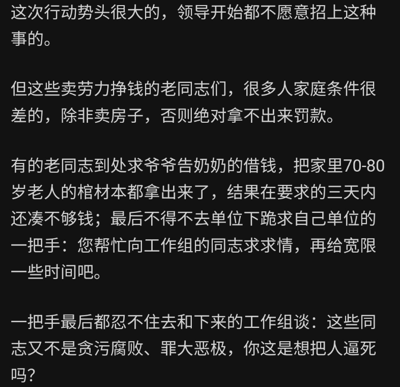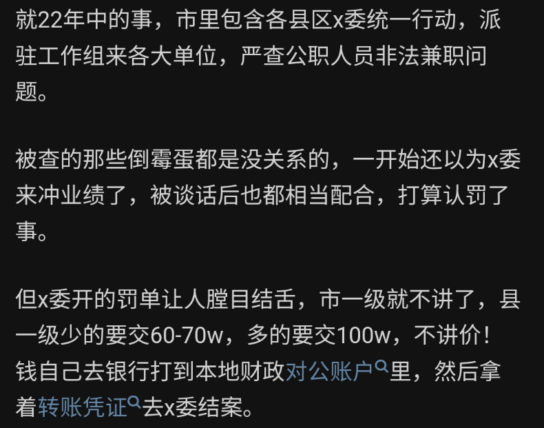 **小晖有感** ![]() 微信号 gh_4c93588fe042 功能介绍 我就是小晖,多谢你能找到我,我继续写,你继续看,可好? ____ ___发表于_ 收录于合集 我始终认为,只要有心去发现,总能发现不同的新鲜事,这样的新鲜事每天都在发生着,而且还在不同的行业里上演着,让网友们看得是目不暇接,异常的精彩纷呈。 就在前两天,江苏地区的公职网友又爆出这样一个内情了,说他们的同行被抄家了。  这回抄家的由头是这个市的公职人员非法兼职,罚得也厉害,少得罚六七十万,多的罚百万。  这一顿操作下来,罚没收入达到25亿。  知乎网友说出公职人员兼职的原因,还是因为那个城市的收入太低了。  这次被罚没的对象也是看人下菜的,基本上就是技术骨干,想安稳退休的那群人。  网友说这一波操作就是冲着钱来的。  很多公职人员为了凑齐罚款,把自己家里老人的棺材本都拿出来了。  为什么要这么搞,还是因为城投负债太高了。  没钱了,就只能搞出这样的操作。  这个网友是昨天早上六点左右分享这个内情的。  这个内情一曝,很多网友都要吃惊了,因为在大众的印象中,江苏应该是很有钱的,可是没想到下面的市也会缺钱到这个地步,以至于这次事业单位的公职人员会成为罚没对象。 江苏尚且如此,那经济状况不如江苏的省份呢?只怕操作会更精彩吧…… PS:今天推荐一个朋友的公众号,他也是写一个系列的,每天会分享各种新奇有趣的事,大家看看就好。他之前没了两个号了,这是他的第三个号……